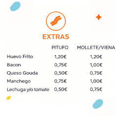 Bacon, dos huevos fritos y salsa brava. (Pitufo y Mollete solo 1 huevo)